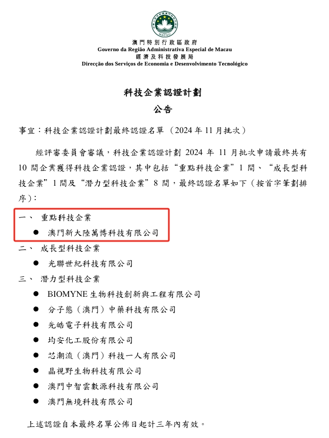 近日,澳门特别行政区政府公布新一批“科技企业认证计划”获认证企业名单。www.乐鱼.com科技集团全球化布局的重要子公司——澳门www.乐鱼.com万博科技,凭借卓越的技术实力、创新能力和市场表现成功获得“重点科技企业”认证,跻身澳门仅六家"重点科技企业"行列。